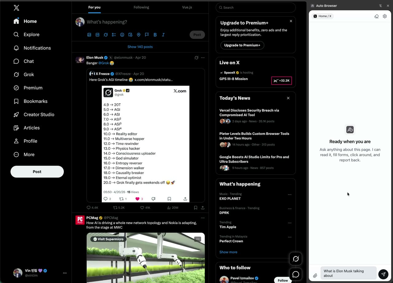 Point it at any X profile and ask what they're up to. The agent scrolls the timeline, reads the posts, and hands back a concise brief.