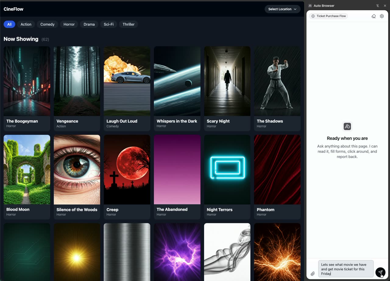 It scans the showtimes on a cinema site, checks in on which film you want, and walks through seat-and-pay — pausing for your final approval.