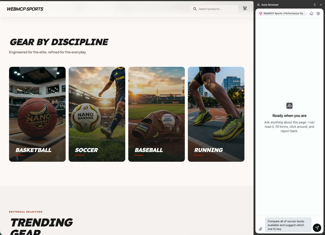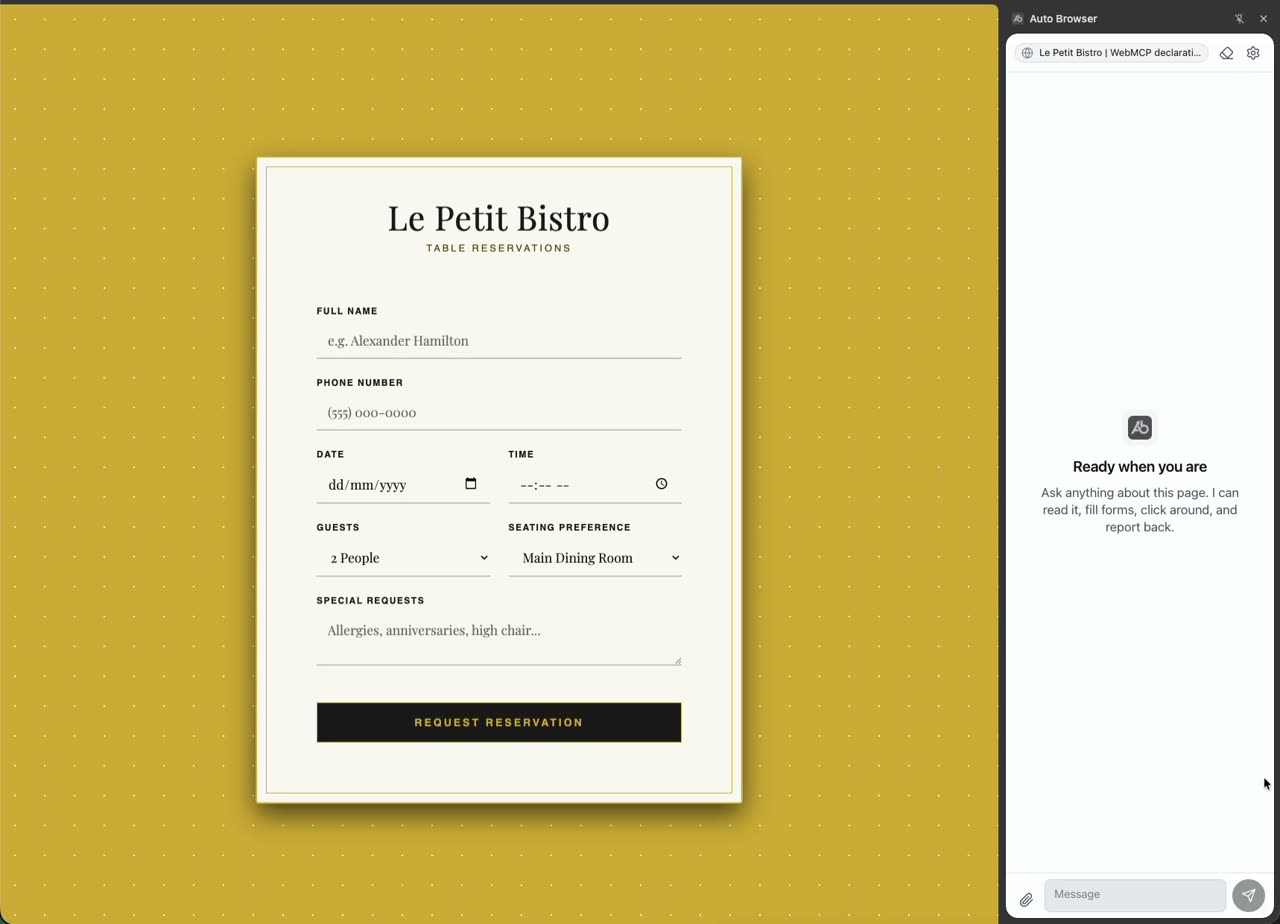 Auto Browser speaks WebMCP — the open web spec that lets your pages describe themselves to any AI agent, not just ours. Tag your forms, expose your actions, and the agent uses your tools instead of poking around the DOM.
