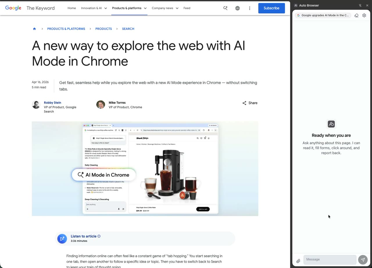 Auto Browser sits in your Chrome side panel. Describe a task in plain English — it sees the page, acts on your behalf, and reports back. No scripts, no servers, no vendor lock-in.